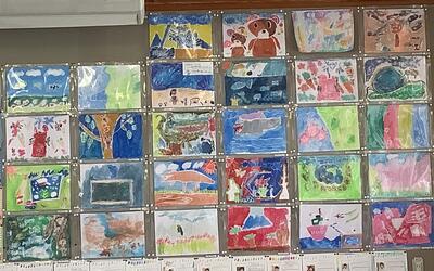 動物と自分の絵を描きました。自分の描きたい動物の写真を見ながら、色使いや構図も工夫して素敵な作品を描き上げていました。