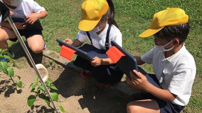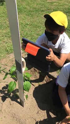タブレットを使って写真を撮ったり、実際に目で見て葉っぱや茎を触ったりして観察しました。