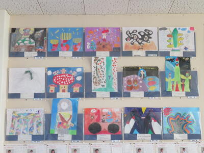 図工で取り組んでいた「へんてこ山の物語」の絵が完成しました。思い思いの山ができあがりました。子どもたちの発想に驚かされます。