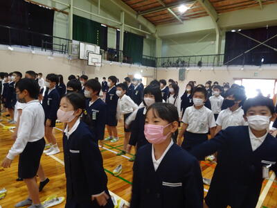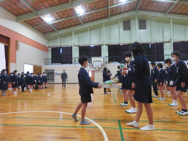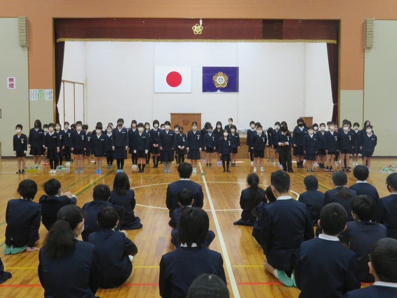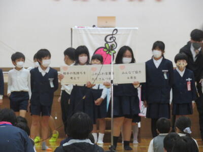 6年生とのお別れ集会がありました。4年生は、6年生の担任の先生クイズの出し物をしました。また、歌と手作りの花を贈りました。短い練習時間ではありましたが、真剣に練習し、6年生への感謝の気持ちを伝えることができたと思います。