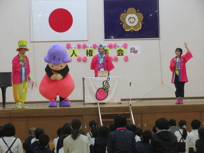 11月7日に人権集会を行いました。4年生で決めた人権宣言「相手の気持ちを考えて、ふわふわ言葉をたくさんつかい、みんなで協力4年生」について代表児童が振り返りを発表しました。また、今日はコッコロ隊の皆さんが来てくださり、クイズに答えたり、みんなで歌に合わせて踊ったりと、心温まる時間を過ごすことができました。