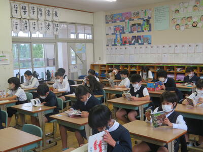 朝8:00を過ぎると、子どもたちが本を持ってきて朝読書が始まります。始めは、集中できないこともありましたが、今では全員が集中して読書をしています。10分弱の短い時間ですが、静けさが広がりとても気持ちの良い時間になっています。