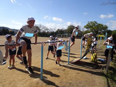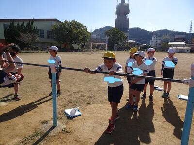 12月中旬から鉄棒を行っています。子どもたちは新しい技に挑戦し、できる技も増えてきました。次は、組み合わせ技に挑戦しています。