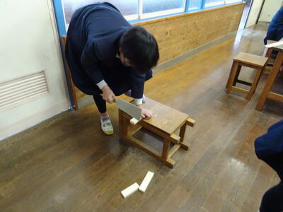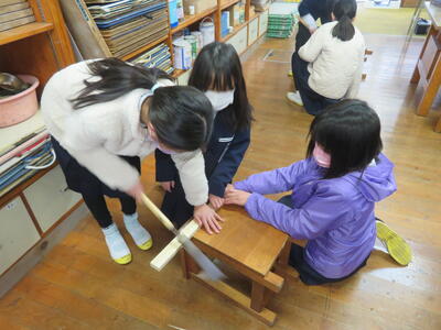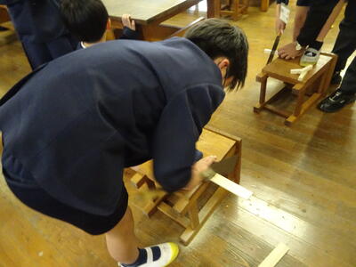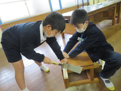 図工の「とんとんつないで」という授業で、木をのこぎりで切ったり、金づちでつなげたりしながらくねくねしている生き物を作っています。のこぎりや金づちを使うのが初めての子どもたちは、苦戦しながらもがんばって作品を仕上げています。どんな作品が出来上がるのか楽しみです。