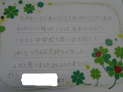 9日(木)に、胎児性水俣病患者の永本賢二さんとの交流会をしました。永本さんの小さい頃のこと、生きている中できつかったことなどをお話してくださいました。子どもたちは、そのお話を真剣に聞いていました。その後、心に残ったことなどをお礼の手紙として書きました。