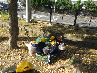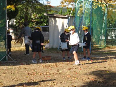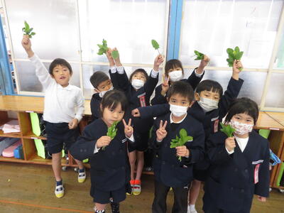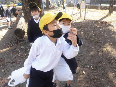 校庭に秋を見つけに行きました!どんぐりや鮮やかな色の葉っぱなどたくさんの秋を見つけた子どもたちでした。