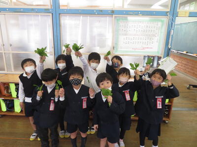 生活科で育てているホウレンソウを収穫しました。葉はまだ少し小さかったですが、たくさん採れて喜んでいました。お家に持ち帰りましたので、ぜひ召し上がってください。