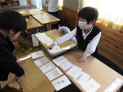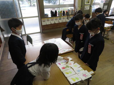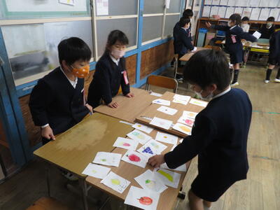 国語「ものの名まえ」でおみせやさんごっこをしました。「いらしゃいませ。」「〇〇をください。」と言いながら、自分たちで作ったカードでおみせやさんごっこを楽しみました。品物が売り切れて、うれしそうにしている子どももいました。