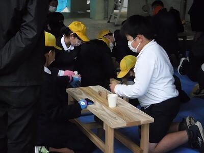12月17日(金)の5・6時間目に、木工教室でベンチを作りました。2人1組で作りましたが、慣れない釘打ちに苦戦しながら、頑張って作り上げました。