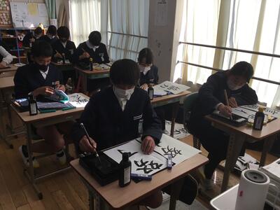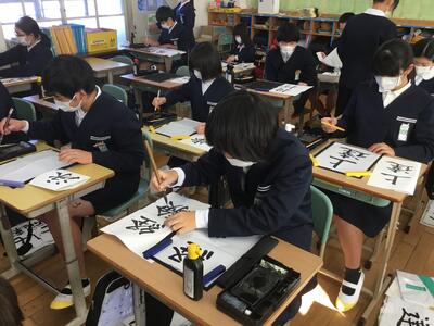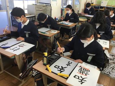 習字で書初めを行いました。それぞれの抱負や頑張りたいことなど、それぞれの児童が選んだ言葉を書きました。
