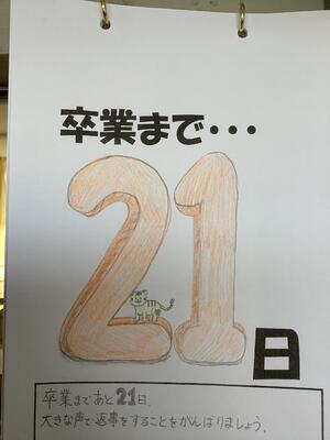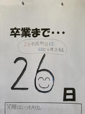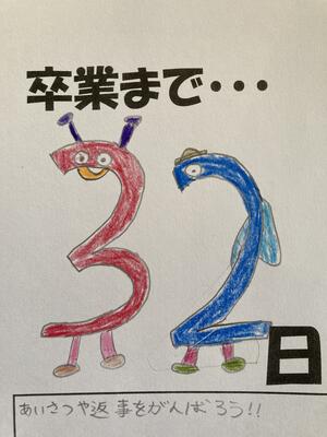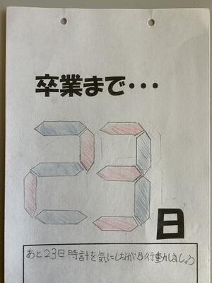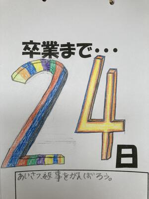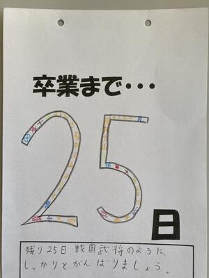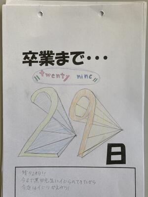 卒業までの登校日数が、いよいよ30日を切りました。学級では、児童が作成したカウントダウンカレンダーで、毎日卒業までの日数を確認しています。