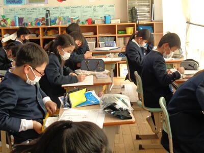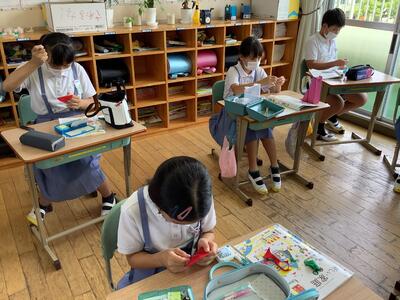 子供たちは、待ちに待った裁縫の学習にわくわくしながら裁縫バッグを開け、用具の使い方や名前を丁寧に