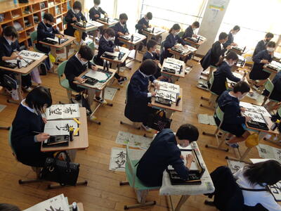 書写で「希望」と書きました。文字の中心、止めの部分、画と画の間隔、払いの方向など、気をつけるところを自分自身で考えて手本に書き込みました。練習をすると、少しずつ筆にも動きが出てきて、文字の形が整ってきました。