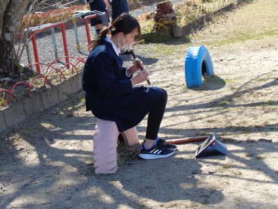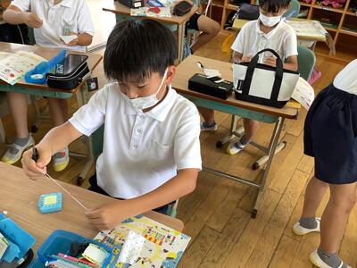 確認していました。授業後半では、長針と糸を使って糸通しにもチャレンジしました。
