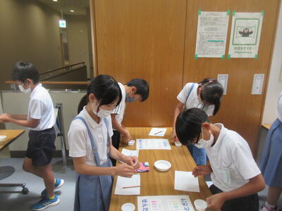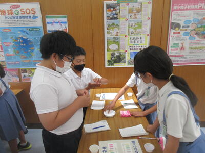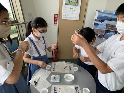 午前の環境学習では、主に水問題を中心に、生活排水が川や湖の水を汚すことやパックテストをもとにどのような生活排水が水を汚すことになるのか実験して確かめました。