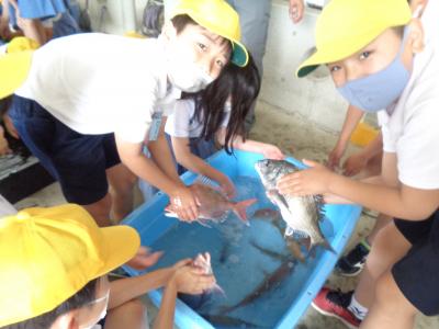 海の生き物をさわる体験では、ちょんと触れるだけだったのが、じょじょに大胆になり、魚をつかみ上げている子どももいました。