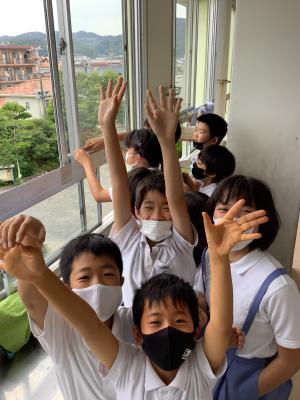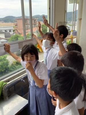 6月11日(金)のある休み時間のことでした。一匹のトンボが5年1組の教室に迷い込んできました。子どもたちはトンボに興味津々。とても嬉しそうにトンボの後を追っかけていきます。そして、トンボは廊下の窓付近に…しかし窓に阻まれて外に出ることができません。それを見た子供たちは次から次へと廊下に集まってきて何とかトンボを外に出してあげようと奮闘します。しかしなかなかうまくはいきません。困り果てた子供達、、、しかし諦めはしません。休み時間も残りわずか、だれもがもうだめかとあきらめかけた時、一人の女の子が一瞬の隙を見逃さずトンボを素手でキャッチ!周りの子供たちからは歓声があがります。そしてトンボを窓の外へ。トンボは何事もなかったかのように空へ飛び立っていきました。子供たちは安堵と達成感に、笑みを浮かべてました。そして休み時間終了のチャイムが子供たちを祝福するかのように鳴り響いたのでした。