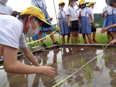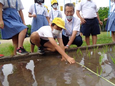 校内の一画で田植えを行ました。3~4本の苗を20cmずつの間隔をとりながら植えていきました。初めて田植えをするお子さんもいて、とても楽しい体験になったようです。さっそく水の世話に朝から出かけて行っています。