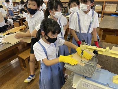図工で電動糸のこぎりを初めて使いました。子どもたちは慎重に板を切っていました。