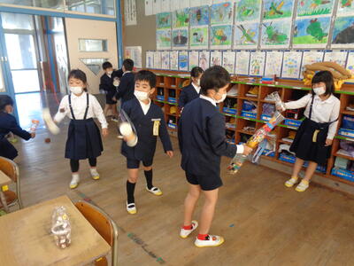 生活科の学習で風車を作って遊びました。紙コップの切り方に苦戦していましたが、思っていた以上に回り、とても喜んでいました。