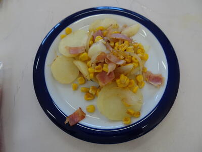 今回は、班で何を作るか選んで実習を行いました。「野菜のベーコン巻き」「ジャーマンポテト」のどちらかを選び作りました。
