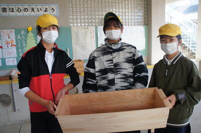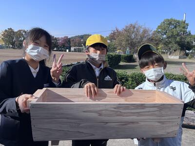 11月21日に水俣・芦北地域木材需要拡大協議会のみなさんに来ていただき、木工教室を開催しました。木をのこぎりで切ったりかなづちで木をつなげたりしながらプランター入れを作りました。