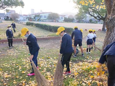 最近、学校のイチョウの落ち葉が道路にたくさん落ちています。それを、登校後のボランティアとしてそうじしています。6年生は5月くらいから何かしらの清掃活動を続けています。最近、他の学年のボランティア仲間も増えてきました。