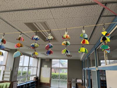 学校では、少しでも気持ちよくすご事ができるように、明るい気持ちのなるようにと、図工で季節の飾りを作りました。折り紙を糊でつなぎ合わせて傘の形を作ります。いろんな色の合わせや模様の組み合わせがあり、カラフルな傘が出来上がりました。