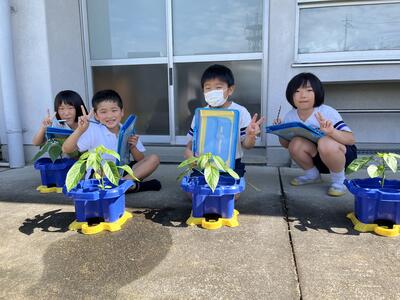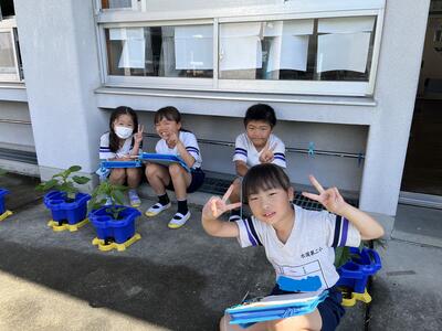 生活科の「ぐんぐんそだて、おいしいやさい」の学習の中で、自分の鉢でピーマンを、学級園でトマト、なす、おくらを育てています!