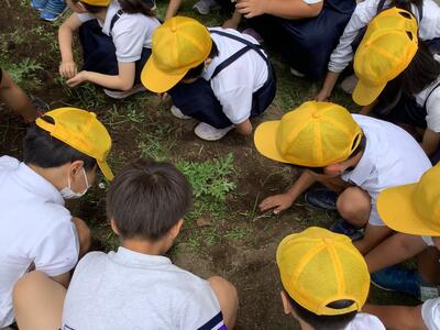 ↑ 水やりや草取りを一生懸命頑張ったおかげで、一人一鉢のミニトマトがたくさん採れています!真っ赤に実ったミニトマト、とてもおいしそうです!また、「小さな友だち」という単元では虫取りをしました。教室内ではメダカも飼育していますが、身の周りの他の生き物も大切にしていきたいですね。