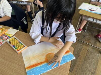 図工「ぼかしあそび」では、クレパスを手やティッシュでふき取りながらぼかし絵を作りました。