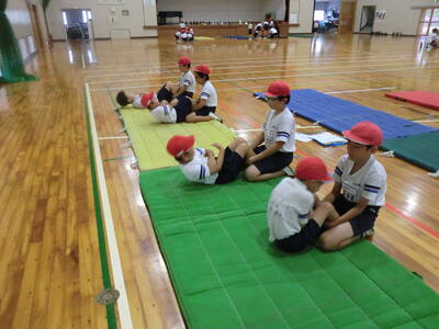 2年生になり、いろいろな技に挑戦しました。前転、後転はもちろん、開脚前転、開脚後転、伸膝後転、ろくぼくの倒立、壁倒立、倒立前転と一通りクリアする子供たちもいて、担任もビックリしました