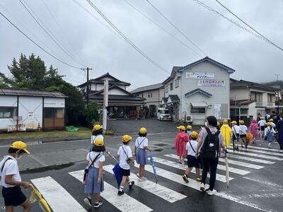 ↑ 生活科「まちをはっけん 大はっけん!」では、水俣市内の町探検に出かけました。天気が危ぶまれましたが、かさやカッパを身に付け、元気に探検へ。「ここのお店は○○くんのおうちだよ!」「ここのハンバーガーおいしいんだよ!」などなど、たくさんの気付きがあった探検でした。