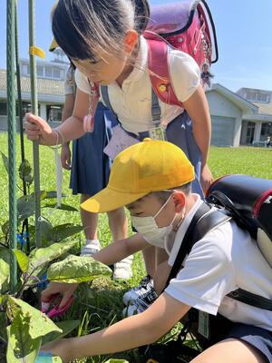 ↑ 生活科で育ている夏野菜が少しずつ収穫を迎えています。今週は、いきもの係の子供たちがオクラを4本収穫しました。「おいしそう~!」「もっとほしいです!」などなど初めての収穫に大満足な子供たちでした。