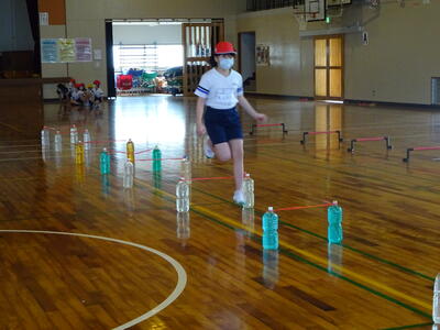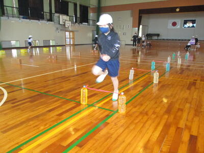 ミニハードルやペットボトル、積木や段ボール箱のハードル走に挑戦しました。