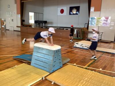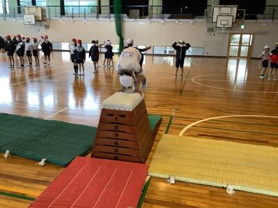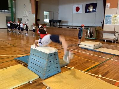 これまでの練習で、開脚跳び・台上前転がきれいな形になり、レベルアップに取り組む子供たちは、首はね跳びにも挑戦中です。