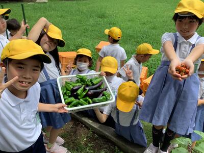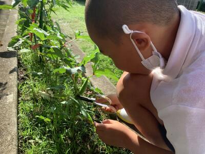 学級園で育てている夏野菜が収穫のピークを迎えています。7月はピーマンだけで約50個、ナスだけで約15本を子供たちも満面の表情で収穫しました。「ナスは天ぷらにして食べます~!」「ピーマンは肉詰めにしてもらいます!」などなど、聞いているだけでおなかがすいてきそうでした。