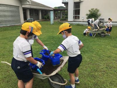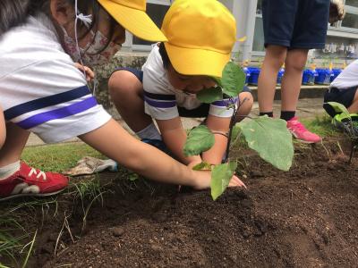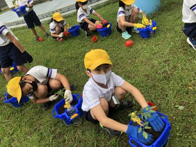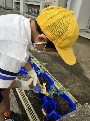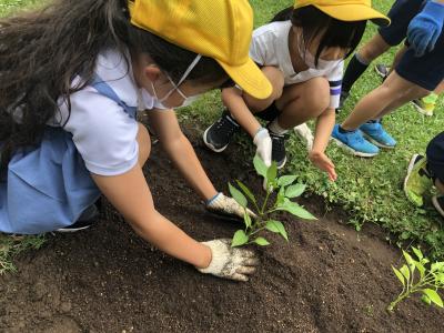生活科でミニトマトは一人一鉢に、その他の野菜は、学級園に植えました。
