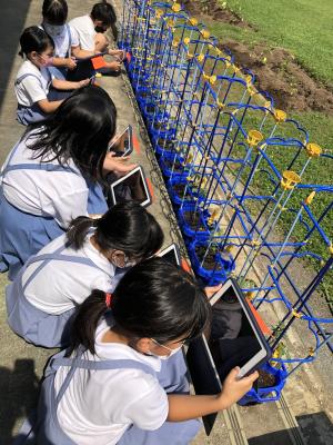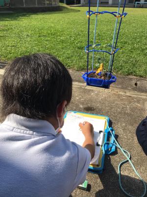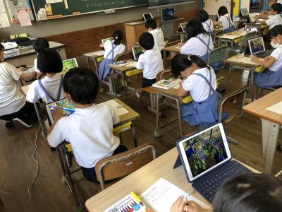 タブレットを使って写真を撮ったり、実際に目で見て葉っぱや茎を触ったりして観察しました。
