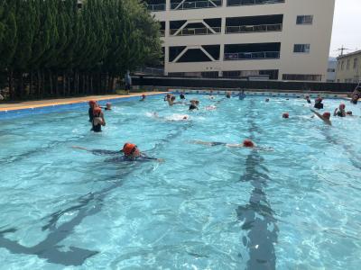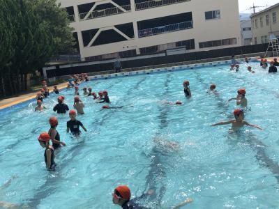 2年生では、各学級でプール開きを行い、先日初めて合同でプールの授業を行いました。