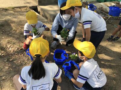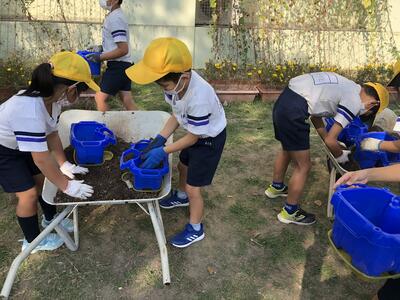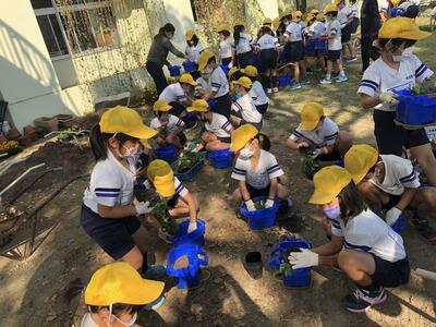 卒業式に向けて、一人一鉢に花の苗を植えました。