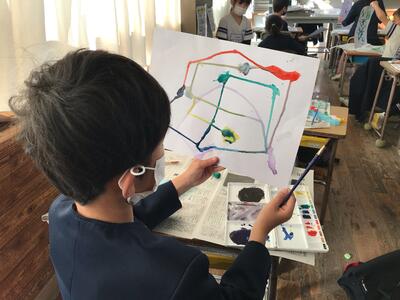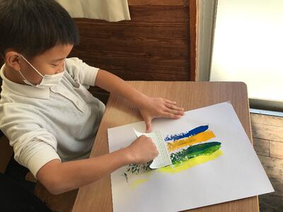 図工では絵の具に水を含ませ、いろんな方向に画用紙を動かして