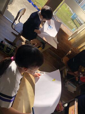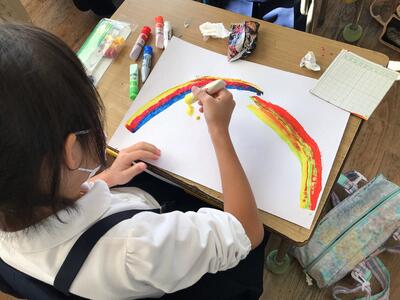 虹のカーテンや虹色の生きものなど思い思いの作品を仕上げました。