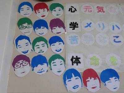 学級目標の掲示と、切り絵で製作した似顔絵がようやく!完成しました。