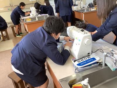 家庭科の学習でミシンを使って、エプロンの製作に取り組んでいます。