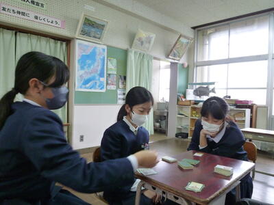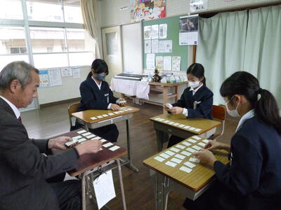 また、同じ日の午後、さくら2組6年生の3人は、二中へ見学に行ってきました。1年生の数学の授業を見せていただいたり、担任の先生と百人一首をしたりととても有意義な時間を過ごすことができました。