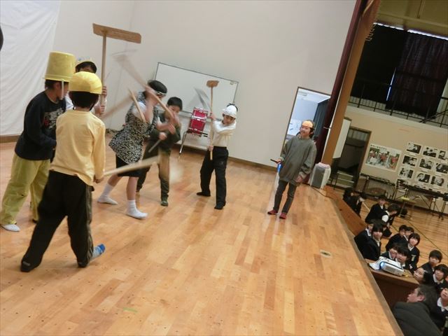6年生全員で手作りしたヤギとオオカミの人形を使い、