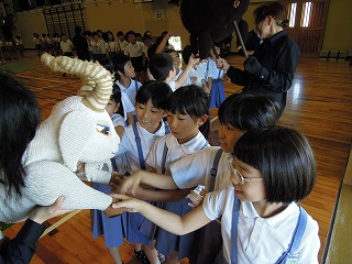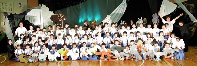 6年生全員で手作りしたヤギとオオカミの人形を使い、