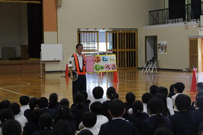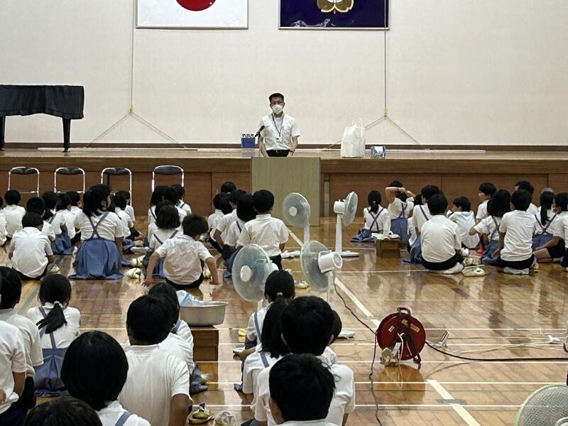 多目的ホールから、3・6年生の代表児童の発表、校長先生の話を放送しました。