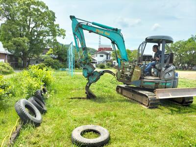 ↑ タイヤを埋めて、「馬跳び」遊びができるようにしました。土が固まったら、遊んでほしいです。